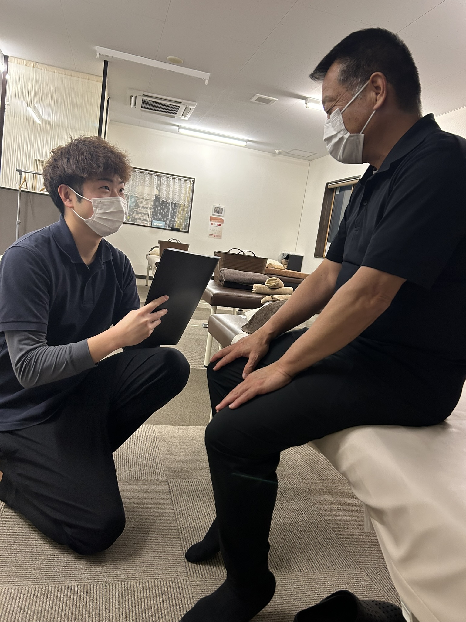 A: パジャマやジャージなど動きやすい服装がいいです。デニムやスカートでの施術はご遠慮ください。
